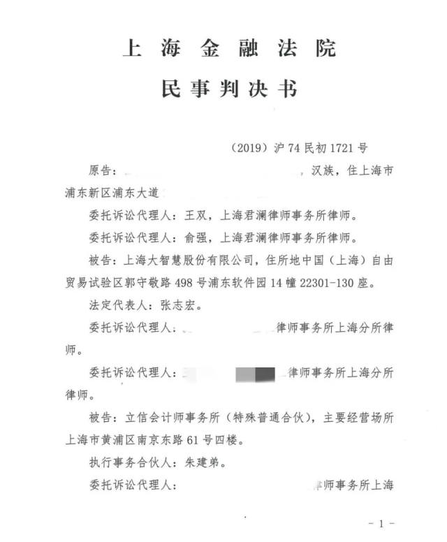 近日,上海君澜律所俞强律师团队收到了代理股民起诉大智慧股份有限公司(以下简称“大智慧公司”)、立信会计师事务所(特殊普通合伙)(以下简称“立信会计师事务所”)证券虚假陈述责任纠纷案的一审胜诉判决书。法院判决大智慧公司赔偿原告投资损失19余万元,并支付以此为基数的利息损失。立信会计师事务所对大智慧公司前述所负义务承担连带清偿责任。