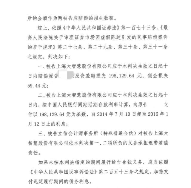 三、被告立信会计师事务所(特殊普通合伙)对被告上海大智慧股份有限公司依本判决第一、二项所负的义务承担连带清偿责任。