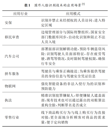 学界普遍认同“人脸识别技术”属身份核验的生物识别技术。有学者将该技术应用模式总结为“1对N”的人脸识别,即指通过对比被识别对象的脸部信息与集中数据库中存储的多个模板信息来辨识身份。此类技术具有无接触、交互性强、高效迅速、符合人类识别习惯等优势,且场景化应用特征明显。