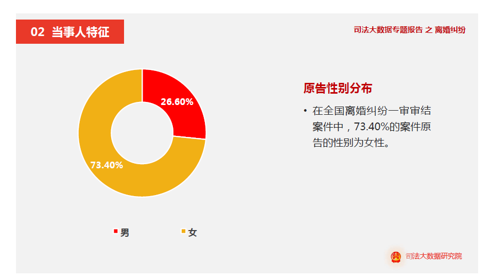 根据最高人民法院于2018年公布的离婚案件司法大数据显示2017年整年的一审离婚案件审结数为140余万件,其中女性原告高达73.4%。而这仅是已经审结的案件统计,那么还有未审结的和通过协议方式离婚的。