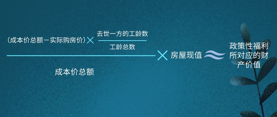 第二种,依照(已死亡配偶工龄对应财产价值的个人部分/成本价总额X房屋现值)进行认定。具体计算方式为:【(成本价总额-实际购房价)X(去世一方的工龄数/工龄总数)】/成本价总额 X 房屋现值。