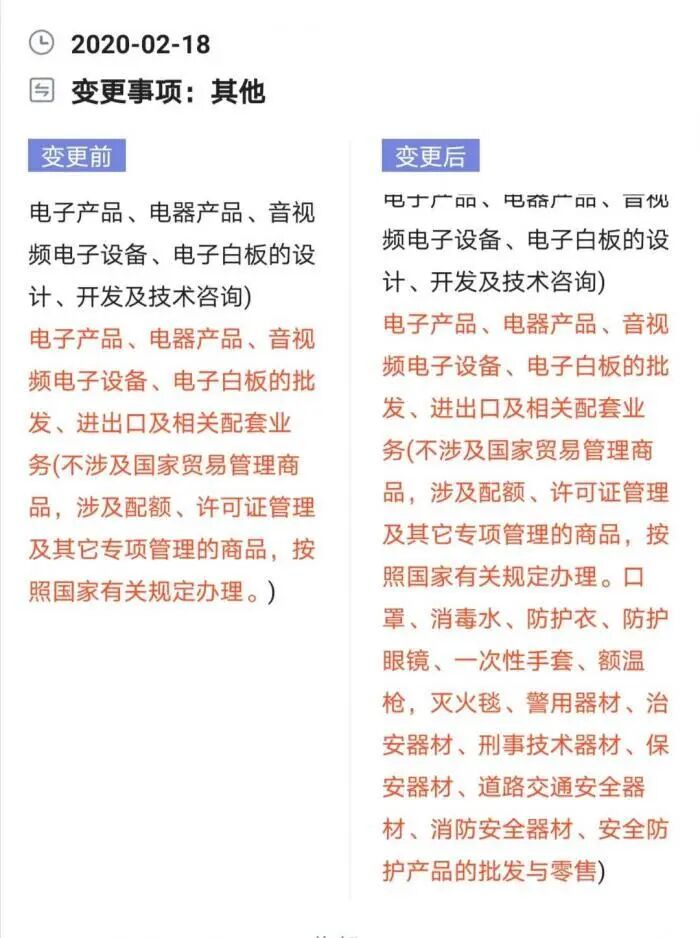 与启迪区块链的情况类似,爱宝达科技涉足疫情防控用品的时间也不长。爱宝达科技原来的经营范围为“电子产品、电器产品、音视频电子设备、电子白板的设计”等。2月18日,公司新增“口罩、消毒水、防护衣、防护眼镜、一次性手套、额温枪,第二、三类医疗器械生产与销售、一类医疗器械的生产和销售”等进入经营范围。