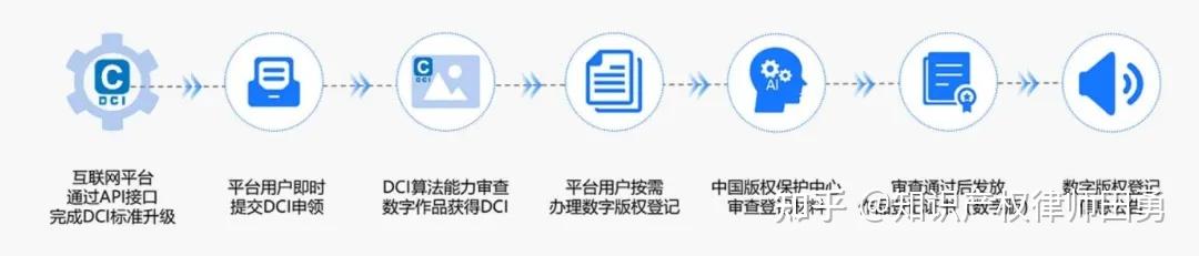 原创作者在创作完成后提交DCI申领。权利人(即原创商家用户)通过蚂蚁链数字版权服务平台向中国版权保护中心(即数字版权唯一标识符管理机构)提交申请材料,符合要求的可获得DCI编码(即数字版权唯一标识符),完成DCI申领。最后,获得DCI之后,可进一步按需自愿办理数字版权登记业务,获得《作品登记证书(数字版)》。