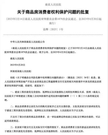 4月21日,人民法院报公布《最高人民法院关于商品房消费者权利保护问题的批复》,明确指出:在房屋不能交付且无实际交付可能的情况下,商品房贷消费者主张价款返还请求权,优先于建设工程价款优先受偿权、抵押权以及其他债权的,人民法院应当予以支持。