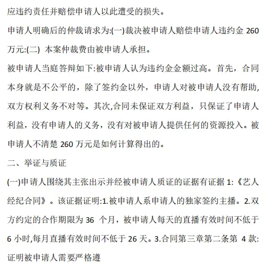 主播当事人去年受到广州一个公会网上签约金诱导,与之签订3年经纪合约拿到3万签约金,约定分成主播拿40%,线上每月直播26天,每天直播6小时,在直播一个多月后,到手收入2.2万元,但是公会方面并未提供什么流量扶持,运营也是每天催播,要么就是嘲讽挖苦主播各种挑刺,威胁主播达不到流水就要赔偿,播不好就要告违约金把主播心态搞炸停播,双方之间在解约协商阶段,公会要价30万违约金,主播不同意,双方未谈拢后公会在合同约定的广州仲裁委对主播进行仲裁,仲裁260万违约金请求如下: