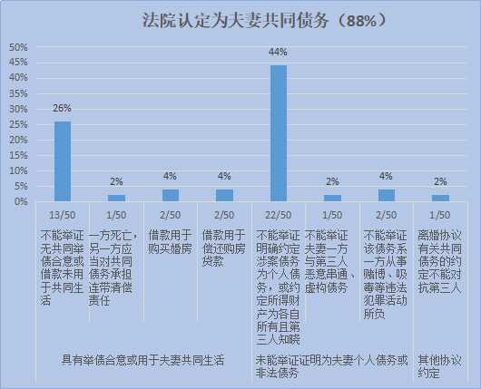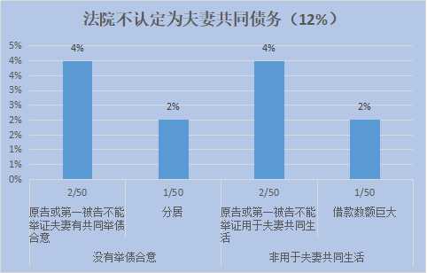 由上图可知,上海法院不认定为夫妻共同债务的比例为12%,判决理由主要有两点:一是没有举债合意,二是未用于共同生活。除分居和借款数额过于巨大(各占2%)外,其中一项重要判断标准是,举债方是否能提供证据证明其夫妻之间有共同举债合意及所举债务用于夫妻共同生活(8%)。