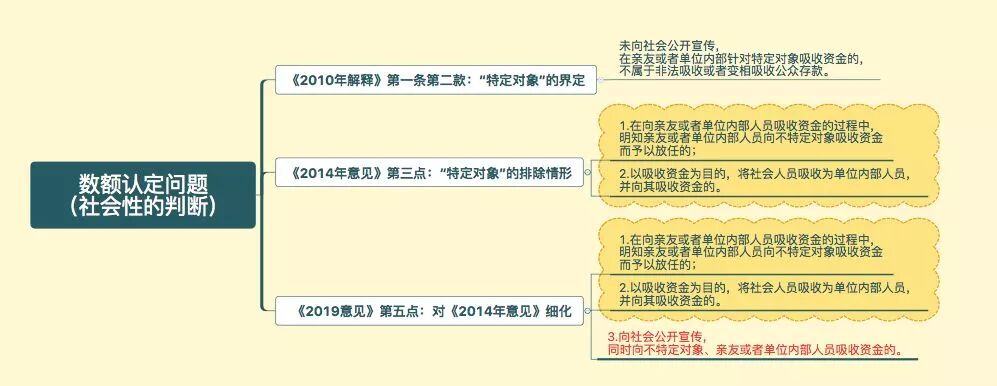 《2019年意见》关于非法集资数额认定问题的内容,本质上是对非法集资涉及的“不特定对象”,也即“社会性”的判断的明确。《2019年意见》明确的三种情形,其实是对《2010年解释》和《2014年意见》的整合和明确。至此,但凡涉案主体在向亲友和单位员工吸收资金的同时,也在向社会公众吸收资金的,亲友和单位员工也属于“不特定对象”,具备“社会性”特征,其所涉及的金额,也必然作为涉案金额。