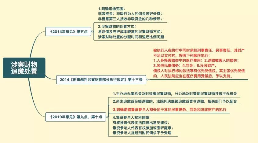《2019年意见》在《2014年意见》第五条的基础上,从集资参与人权利保障角度,对强化了对集资参与人的退赔力度,《2019年意见》第九点明确:“退赔集资参与人的损失一般优先于其他民事债务以及罚金、没收财产的执行”。事实上,该意见只是对2014年最高院《关于刑事裁判涉案财物部分执行的若干规定》(“《2014涉案财务执行规定》”)第十三条的重申。而在民事债权人对执行标的主张民事优先受偿权的情况下,退赔损失与民事债务执行孰者优先问题,《2019年意见》并未予以明确,笔者认为,对该问题在实践中司法机关还是应根据《2014涉案财务执行规定》操作,即债权人对执行标的主张民事优先受偿权的情况下,还是应优先保障民事优先权利,避免“先刑后民”做法影响或否定民事优先权设定本身对债权人民事权利保障的法律价值。