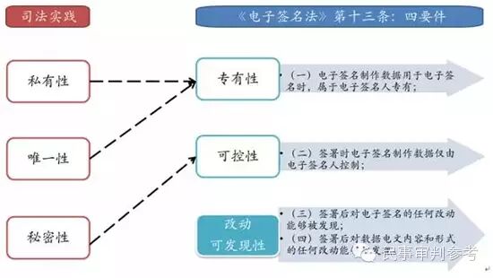 在签名可靠性方面, 满足何等条件的电子签名能被认定为是可靠的电子签名, 从而起到《电子签名法》第十四条所规定的"与手写签名或者盖章具有同等的法律效力"的效果, 在法律规定和司法实践中存在细微的差别。