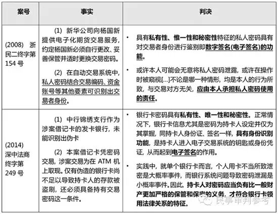 《电子签名法》第十三条对于可靠的电子签名做出了具体的技术要求, 可总结为三点: 专有性、可控性与改动可发现性。然而, 司法实践中采用的标准却有所不同。以浙江省高级人民法院(2008)浙民二终字第154号民事判决书与深圳市中级人民法院(2014)深中法商终字第249号民事判决书为例, 两个案例相隔6年, 且审级与审理法院都不尽相同, 但在对电子签名的认定上都采取了"私有性、惟一性和秘密性"标准, 认为在自动取款、网络银行等电子化交易服务中, 私人密码具有私有性、唯一性和秘密性, 具备对交易者身份进行鉴别的功能, 从而起到电子签名的作用。
