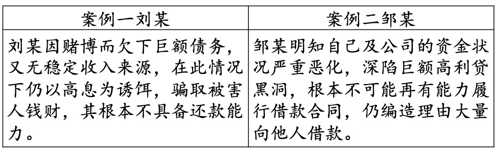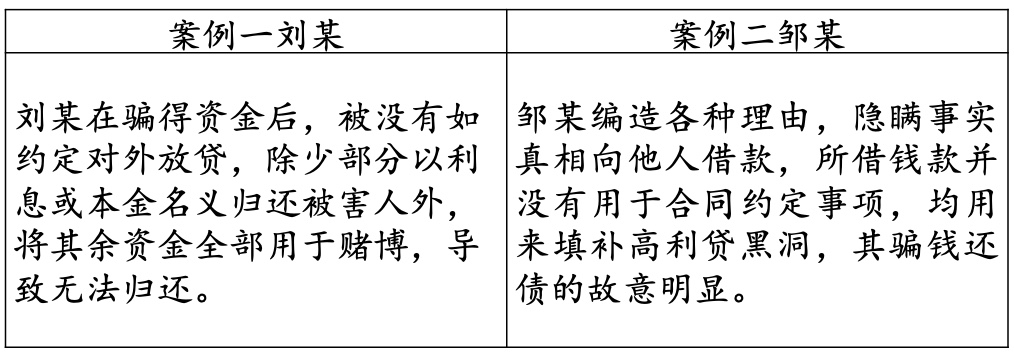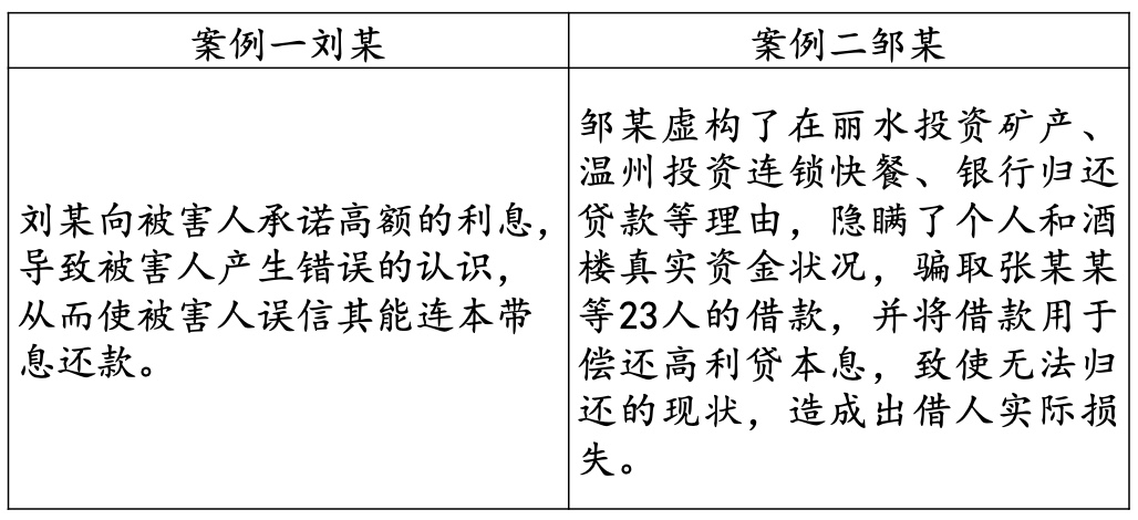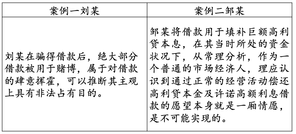 案例一中的被告人刘某在庭审中辩称自己借款后有支付利息和本金给被害人,其主观上没有非法占有目的;案例二中的被告人邹某也辩称自己主观上没有诈骗故意,客观上没有虚构事实,主张自己无罪。最终二人都以诈骗罪被判刑,具体理由详述如下: