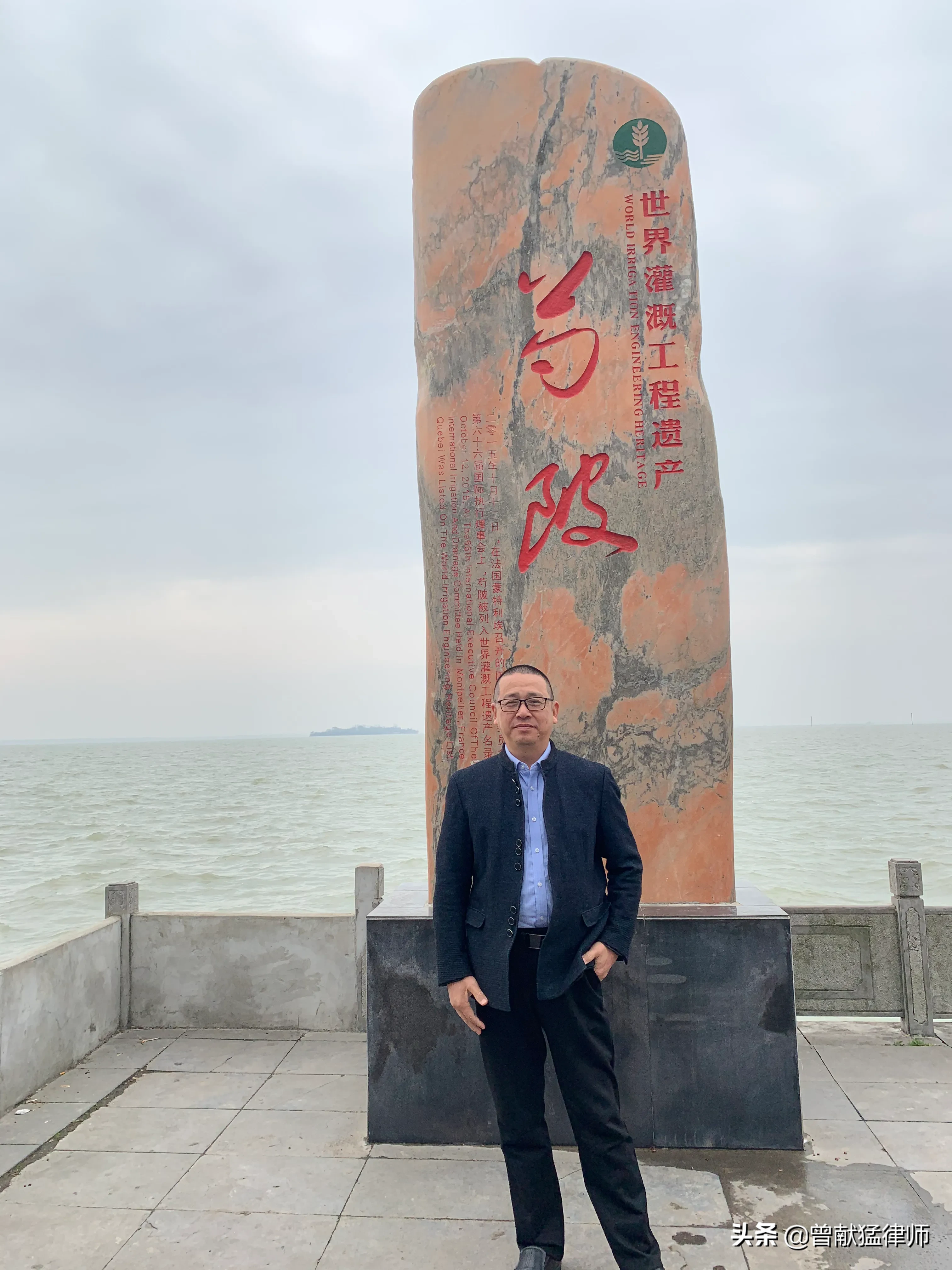 终于来到安丰塘,安丰塘上一块石碑,刻着安丰塘的前名“芍陂。”孙律师问我,这“芍陂”两个字读音你会不会读?我说,那不是“shao bei”吗?孙律师说,第一个字不念“shao”,念“que”。我查了读音,确实念“que”。