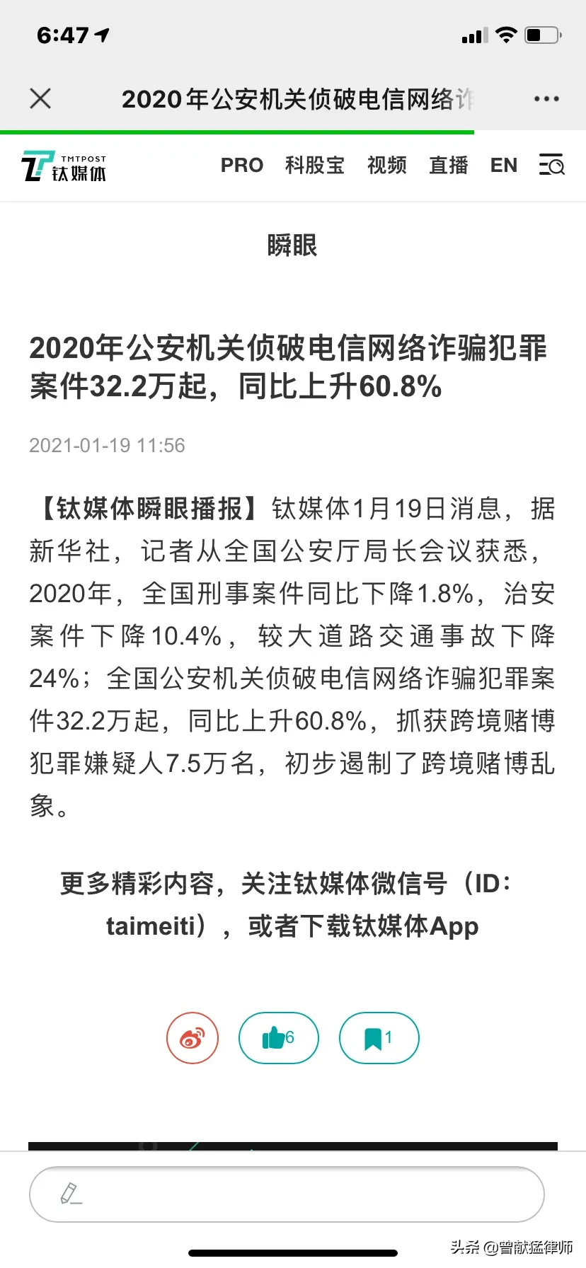 根据钛媒体顺眼播报,2020年全国公安机关侦破电信网络诈骗犯罪案件达到32.2万件,比上一年度上涨60%以上,即便按照每个案件1人也有32.2万人涉案,如果按照网络犯罪多人作案的特征,按每个案件4人计算,则有128.8万人涉案。我认为这个统计数据应该含了很大的水分,与两高工作报告相差太远,所以不可信。但是,网络犯罪,特别是电信网络诈骗案件飞速增长是这几年的趋势,包括开设赌场罪案件,以及由电信网络诈骗案件和开设赌场罪案件衍生出来的“帮助信息网络犯罪活动罪”、“掩饰隐瞒犯罪所得罪”,这些年也呈稳步上升趋势。