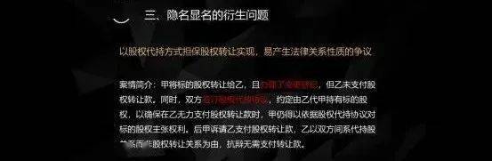 它风险集中的表现在,如果产生了争议,到底以哪一份合同为准,是以备案的阳合同的为准,还是以我们双方本来想履行的阴合同为准。通常备案的阳合同约定的转让价款,都是会低于真实的履行价款。合同履行当中受让方又经常以备案的价格比较低的阳合同,来主张减少股权转让价款。