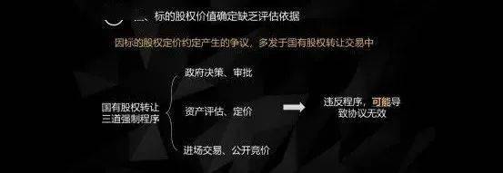 股权和股权转让会因为评估价值产生争议的这种情况多发于股权转让和国有股权转让的场合。普通的私有股权转让会相对比较少。国有股权转让,法律规定了三道非常明确的程序性的要求,1、政府决策、审批。2、资产评估、定价。 3、进场交易、公开竞价。违反了这三道程序性要求,从最高院的裁判案例来看,也不一定 必然导致股权转让协议无效。假如仅仅只有程序性问题,可能不会直接认定无效,但如果不仅有程序性问题,同时还具备合同法第五十二条合同无效的情形的话,就会变成无效。