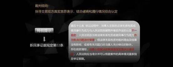 特别提示一下,新的民事证据规定第五十三条,有关于当事人主张与法院认定性质不一致的情形。这情况在原来的民事诉讼民事证据规定里面,是说法院关于法律关系应当进行释明。但是新的民事诉讼证据规定是改了,改为 将法律关系性质作为焦点的问题来审理,然后由当事人自行决定是否变更诉讼请求。