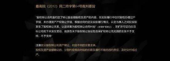 最高院的裁判要旨:“股权转让合同约定了转让股全部股权及资产的内容,在实际履行中仅对股权办理过户手续,未办理资产产权转让手续,根据合同约定及实际履行情况,认定当事人之间仅实际发生了股权转让关系,认定本案为股权转让合同纠纷(涉采矿权转让),采矿许可证仍在目标公司名下未发生变动,故原告关于股权转让协议包含采矿权转让而无效的主张不予支持”