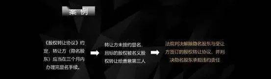 看一个简单的案例,协议当中是约定转让方也就是隐名股东,在三个月内办完显名的手续,然后再把股权变更登记变更给受让方。但是转让方没有按照约定写明,并且在期限当中,标的股权又被名义股东转让给了另外一个善意的第三人,第三人因为是善意的,所以取得了股权。这种情况下,转让方和原本的双方签订的股权转让协议,由于无法再继续履行,所以法院最终的判决是解除了隐名股东,与在先转让方签订了股权转让协议,并且判决了隐名股东承担违约责任。