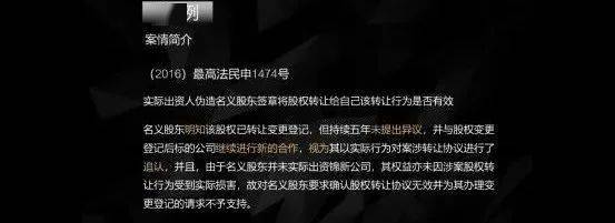 在案件当中,裁判的要旨是:名义股东明知该股权已经转让变更登记,但持续五年都没有提出异议,并且与股权变更登记后的标的公司继续进行新的合作, 视为其以实际行为对案涉转让协议进行了追认,并且由于名义股东并未实际出资,即使股权转让了,权利其实也没有受到实际的损害。故对于名义股东起诉要求确认股权转让协议无效,并且为其办理变更登记的请求,法院判决不予支持。